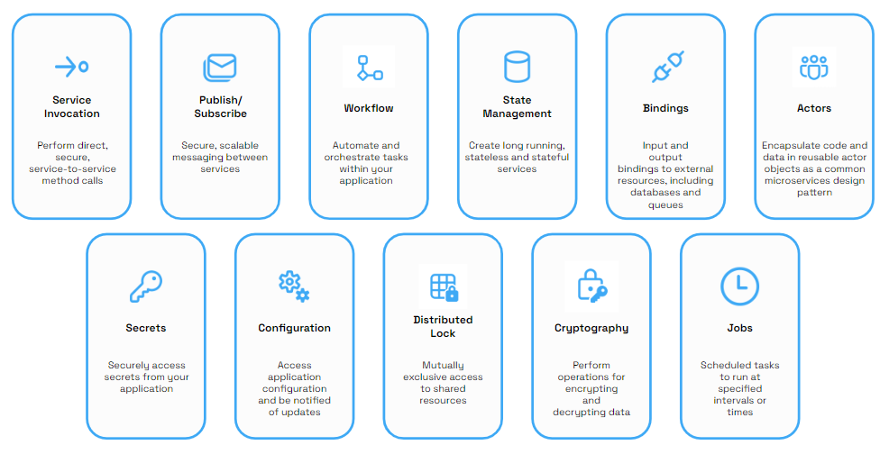 | Resource bindings | Resource bindings with triggers builds further on event-driven architectures for scale and resiliency by receiving and sending events to and from any external source such as databases, queues, file systems, etc. |