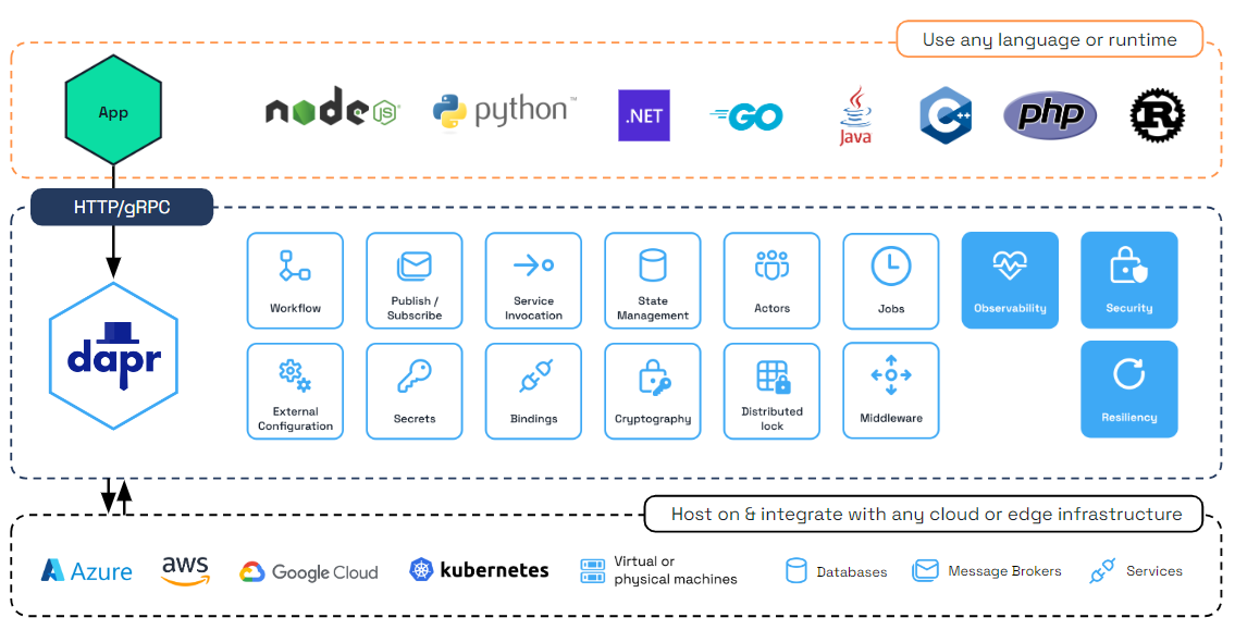Dapr provides distributed system building blocks for you to build microservice applications in a standard way and to deploy to any environment.