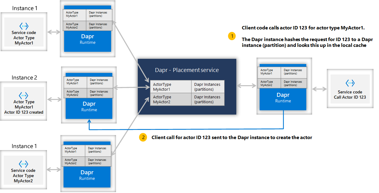 This partition data table for each actor type is updated and stored in each Dapr instance running in the environment and can change dynamically as new instances of actor services are created and destroyed.