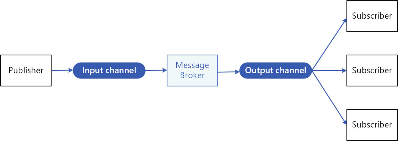 An intermediary message broker copies each message from a publisher’s input channel to an output channel for all subscribers interested in that message. This pattern is especially useful when you need to decouple microservices from one another.