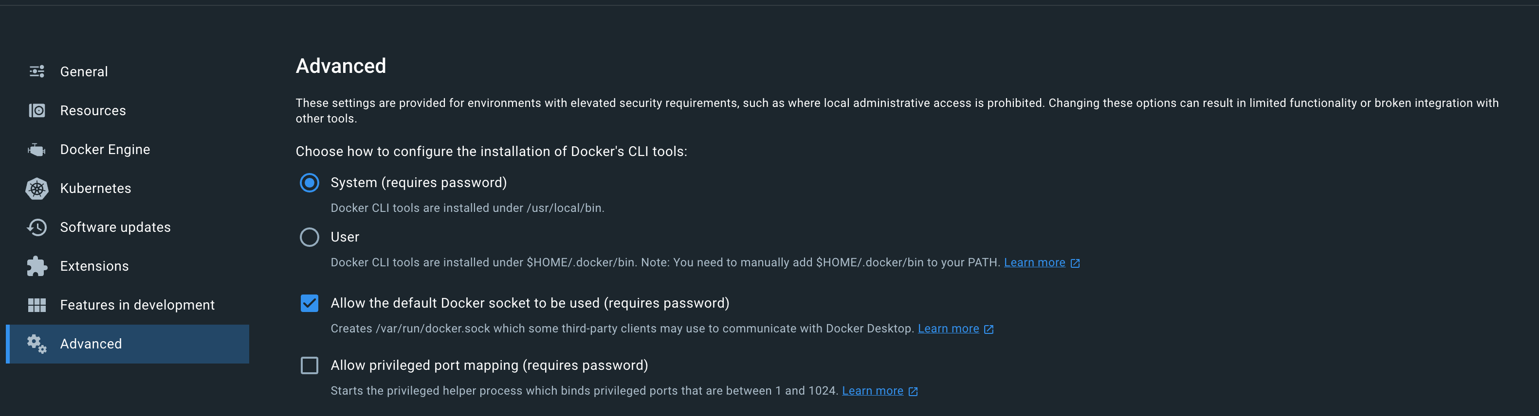 In Docker Desktop’s advanced options, verify you’ve allowed the default Docker socket to be used. This option is not available if you are using WSL integration on Windows.