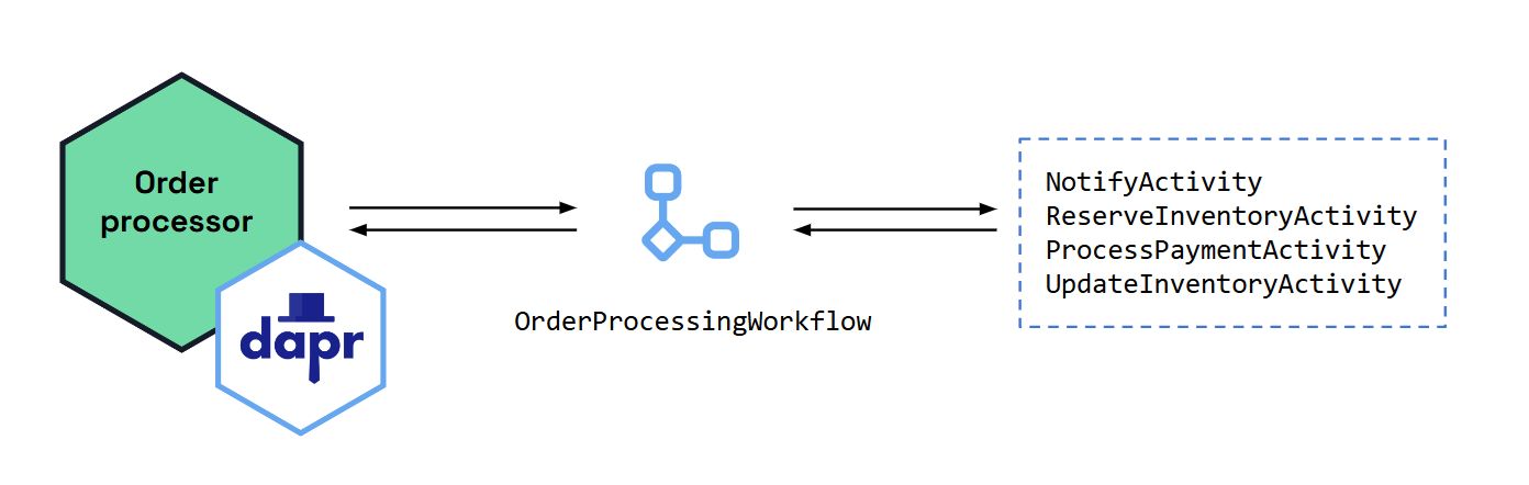 The order-processor console app starts and manages the order_processing_workflow, which simulates purchasing items from a store. The workflow consists of five unique workflow activities, or tasks: