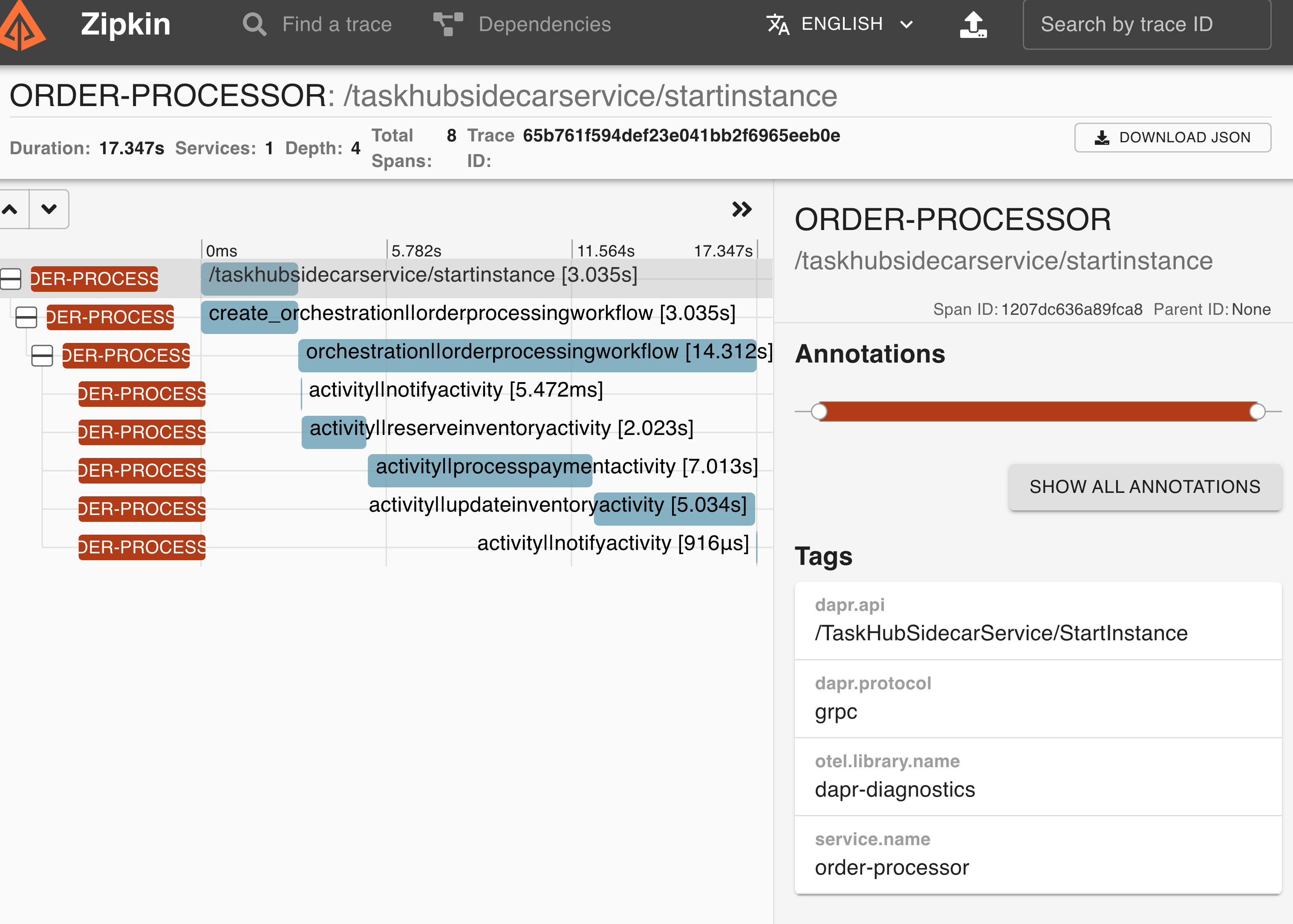 View the workflow trace spans in the Zipkin web UI (typically at http://localhost:9411/zipkin/).