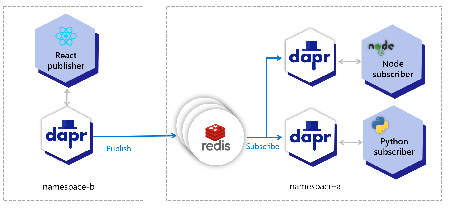 Namespaces are a Dapr concept used for scoping applications and components. This example uses Kubernetes namespaces, however the Dapr component namespace scoping can be used on any supported platform. Read How-To: Scope components to one or more applications for more information on scoping components.This example uses the PubSub sample. The Redis installation and the subscribers are in namespace-a while the publisher UI is in namespace-b. This solution will also work if Redis is installed on another namespace or if you use a managed cloud service like Azure ServiceBus, AWS SNS/SQS or GCP PubSub.